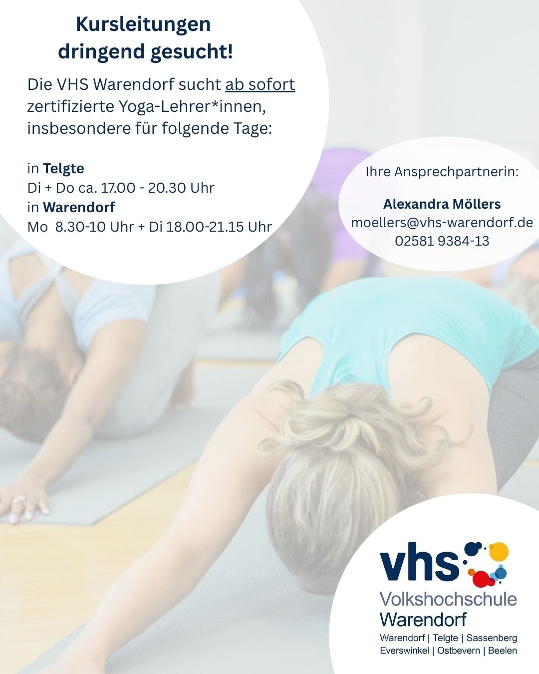 Interessierte werden gebeten, sich bei der Programmbereichsleitung für den Programmbereich Bewegung & Gesundheit Alexandra Möllers zu melden. Aktuell suchen wir konkret Dozent*innen für bestehende Kurse montags, dienstags und donnerstags in Warendorf und Telgte. Auch andere Zeiten und andere Orte sind nach Absprache möglich.